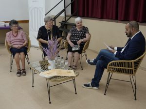 D’esquerra a dreta, Valentina Domènech, Maria Cinta Nogués i Isabel Mestre, amb el moderador del col·loqui, Andreu Prunera.